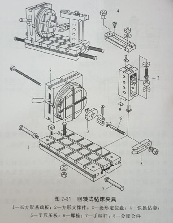 下圖是一套合成的回轉式鉆床夾具圖示及該夾具的元件組成部分: