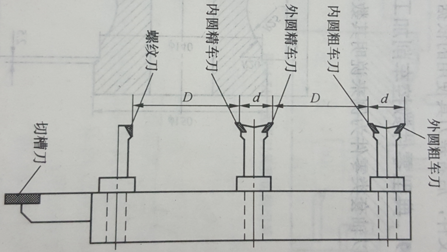 從上圖可以看出數控車床的內、外圓車刀是背靠背并列在一起的,刀具的距離d應等于或小于管材毛坯內徑。這樣排列刀具的目的是為了保持數控車床在加工過程中主軸始終朝一個方向轉動,避免主軸反轉;內圓粗車刀與外圓精車刀之間的距離D應大于管材毛坯的內外半徑之差。在使用排刀法時,程序與刀具的位置有關。